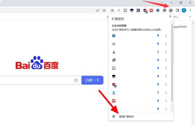 1、在谷歌瀏覽器的右上方,點擊擴展程序,出現下拉,單擊管理擴展程序進入。