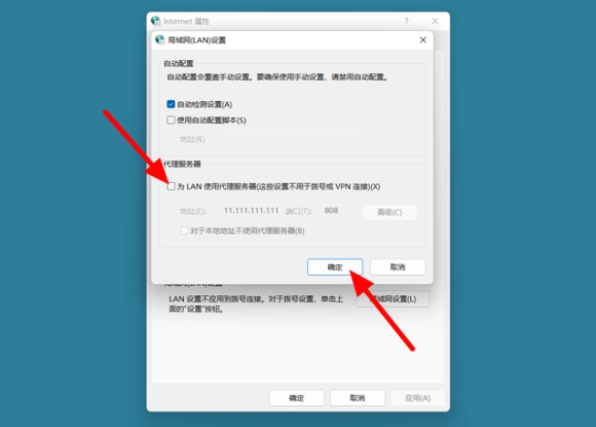 3、取消勾選為LAN使用代理服務器,點擊確定,即可完成恢復。