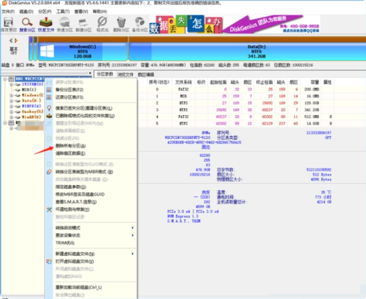 2、打開pe系統桌面的DiskGenius分區軟件,右擊電腦磁盤,選擇刪除所有分區即可。