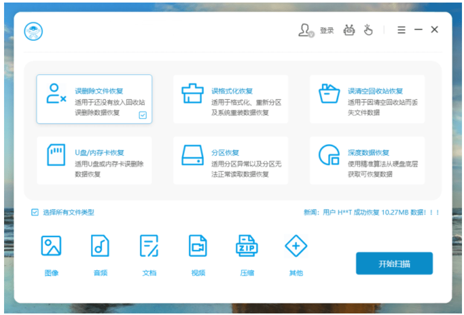 1、首先選擇好自己誤刪的文件是屬于哪種類型,選擇好類型之后,點擊開始掃描,執行掃描文件的操作。