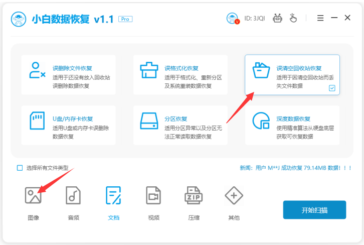 打開小白數據恢復軟件的功能界面,根據自己的需求選擇不同的恢復方式。(這里就以“誤清空回收站恢復為例”,進行掃描)
