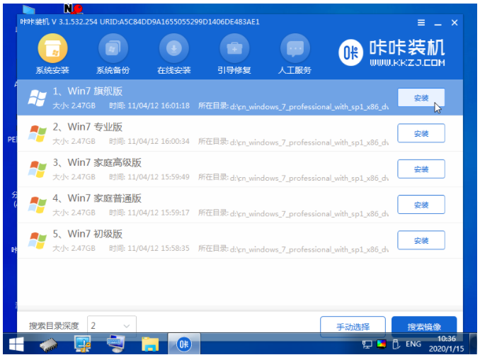 5、在pe系統,打開咔咔裝機工具,選擇需要安裝的win7系統,點擊安裝即可。