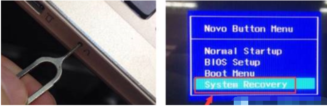 將聯想YOGA 530電腦強制關機,找一根卡針,插入筆記本的一鍵恢復小孔(不同筆記本恢復孔的位置不一樣),進入Novo Button Menu,按下方向鍵選擇,并回車System Recovery選項。