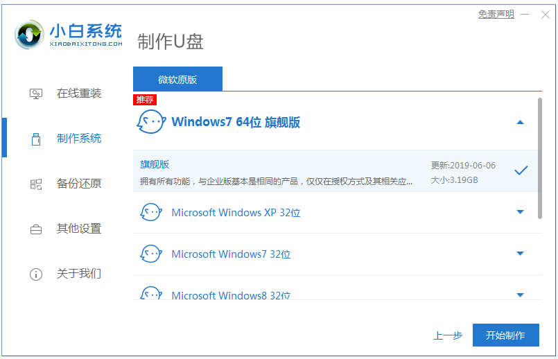 選擇需要的windows系統,點擊開始制作u盤啟動盤。