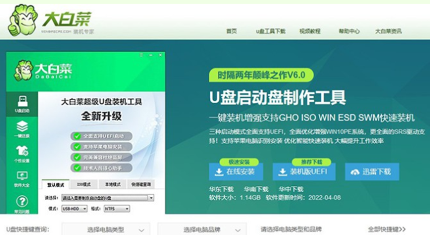 1、下載大白菜U盤啟動盤制作工具,用于制作U盤啟動盤。