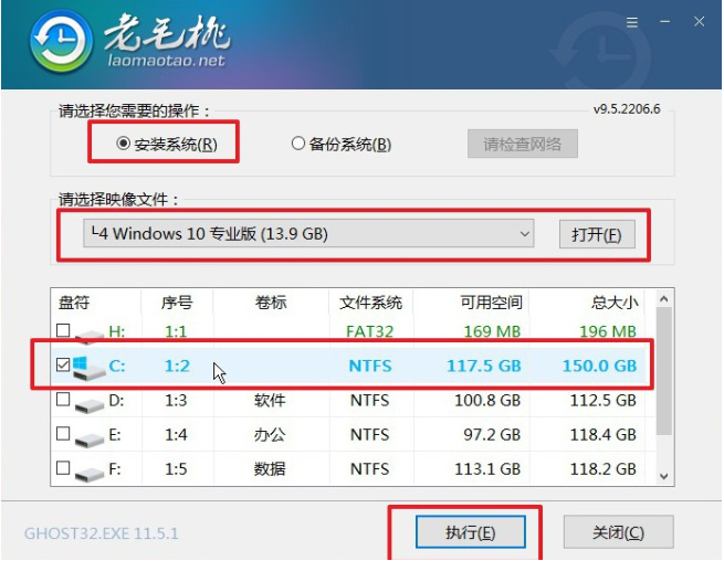 5、 打開老毛桃一鍵裝機,點擊瀏覽打開win10系統鏡像,安裝在c盤,點擊執行。