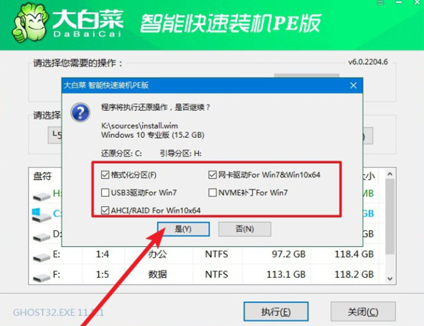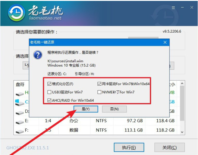6、 注意u盤裝系統過程不要斷電,彈出還原窗口時,點擊是。