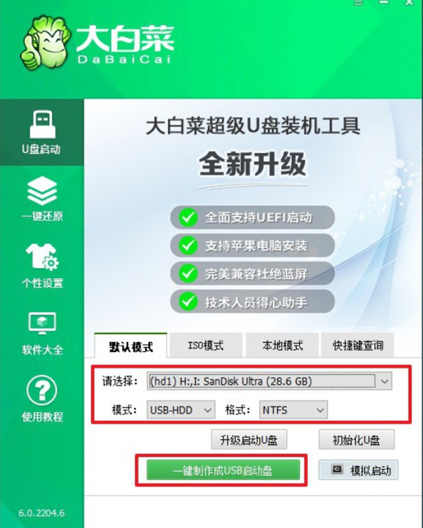 2、 將u盤接入電腦,打開制作工具,設置模式USB—HDD,格式NTFS,點擊一鍵制作u盤啟動盤。
