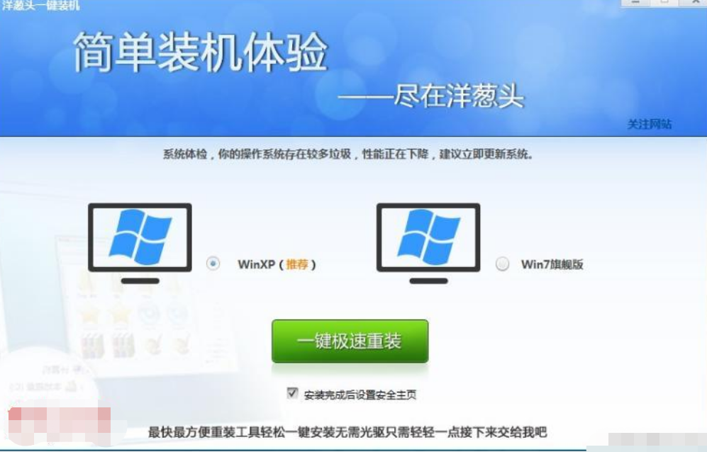 2、操作簡便直觀,輕點一鍵重裝,接下來的交給洋蔥頭吧;