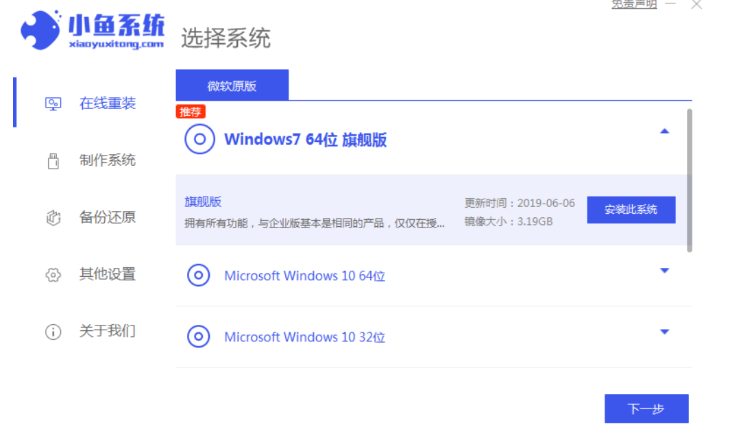 1、下載小魚一鍵重裝系統并打開,點擊在線重裝選擇系統版本,點擊安裝此系統;
