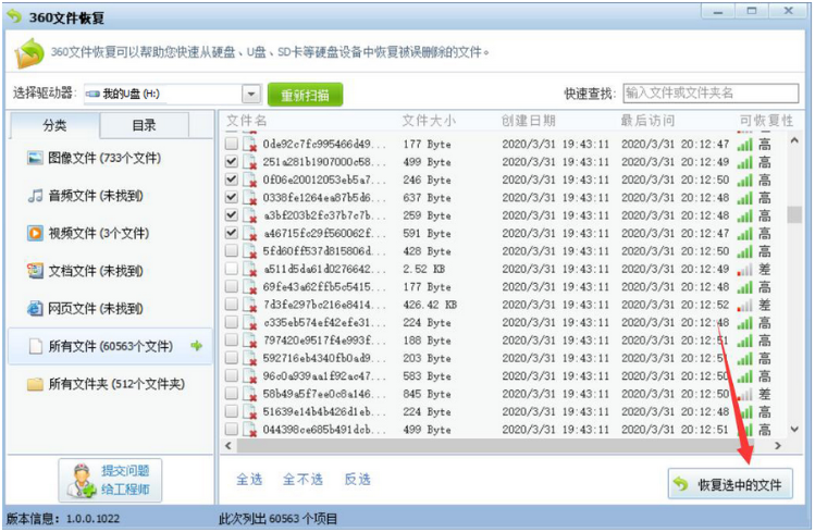 4、掃描完成后,選擇需要恢復的文件,點擊“恢復選中的文件”。