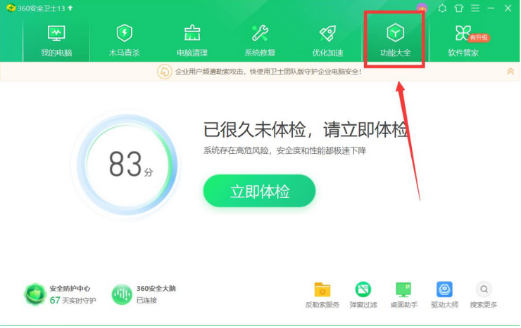 1、首先將u盤插入電腦中,打開360安全衛士后,點擊上方的“功能大全”。