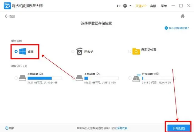 2、選擇好恢復模式后,選擇原來的數據保存的位置,比如“桌面”,選好點擊“開始掃描”。
