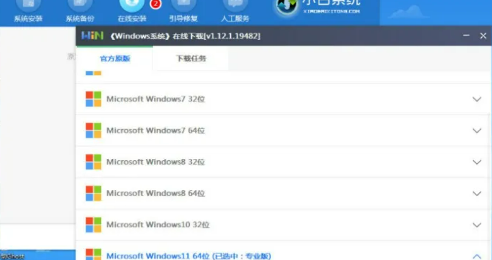 下載安裝小白一鍵重裝系統選擇需要安裝的系統,重啟后進入 PE 系統,執行分區。分區成功后,選擇需要重裝的windows鏡像文件。