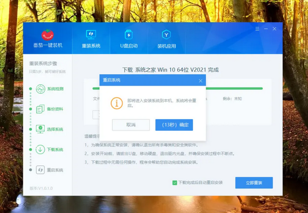 第六步,下載完成,準備進入自動安裝。可以點確定直接進入重啟系統,執行自動安裝程序。