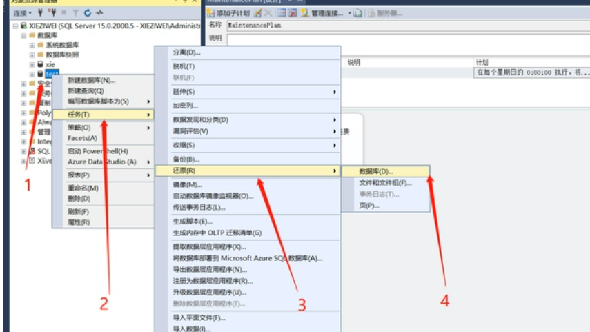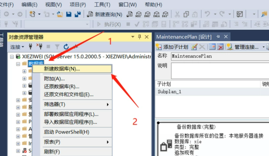 先連接數據庫、然后點【管理】--【維護計劃】;對著【數據庫】右鍵--【新建數據庫】--然后隨便命名;然后還原數據庫。