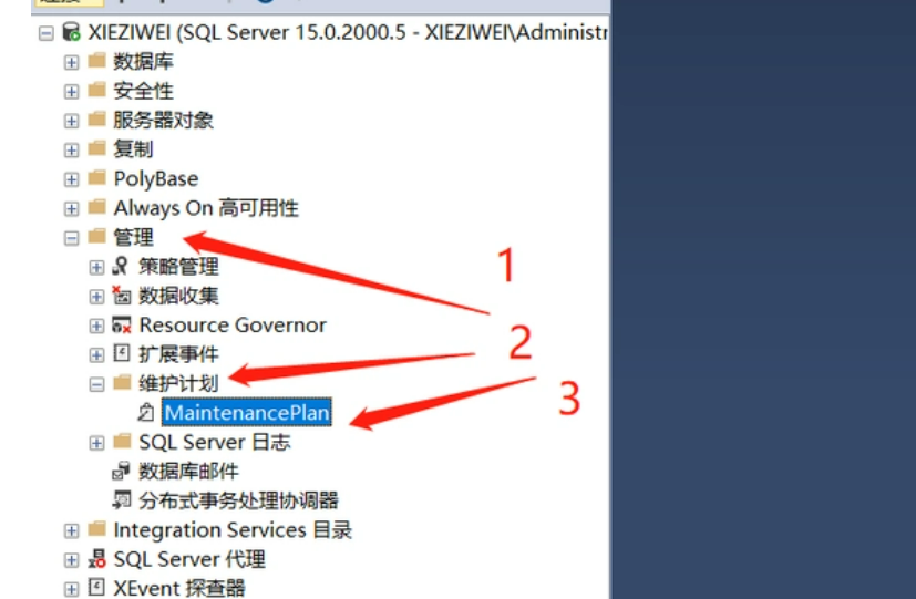 1、先連接數據庫、然后點【管理】--【維護計劃】,如下圖中的【維護計劃】下還有個文件那就是有備份了;