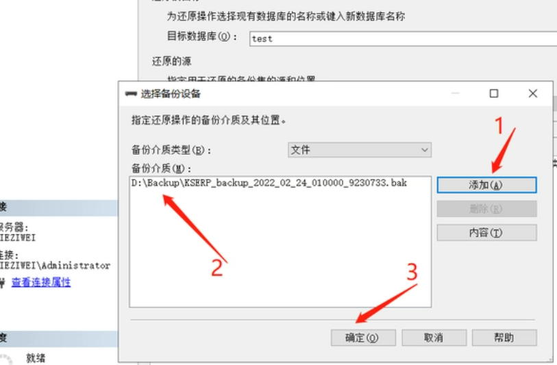 8、彈出選擇文件框,點【添加】--然后選剛剛的XX.bak文件--我這里就是放在D盤、一下子就找到了,確定。