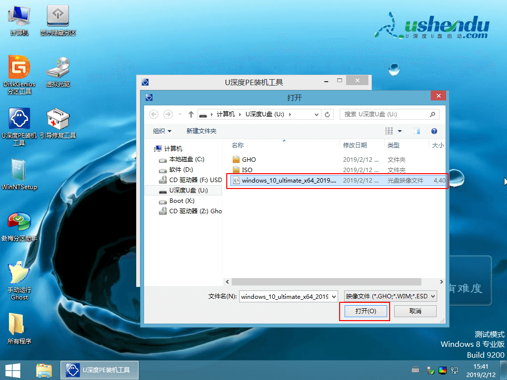 接著找到并選中u盤啟動盤中的win10系統鏡像文件,點擊“打開”即可,如下圖所示: