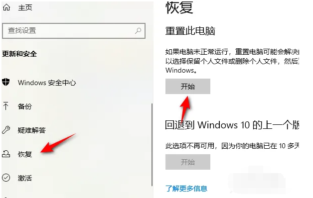 2、點擊左側的恢復,再點擊重置此電腦下方的開始。