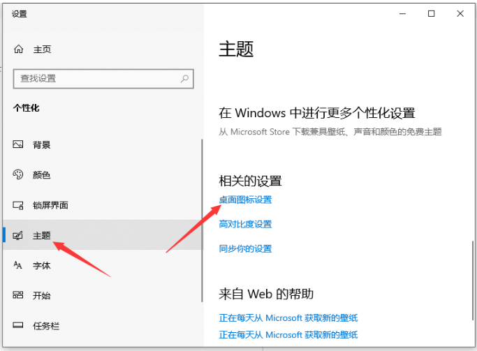 2、在窗口的左側點擊主題,然后在相關的設置選項功能欄中可以看見桌面圖標設置功能,單擊進入。
