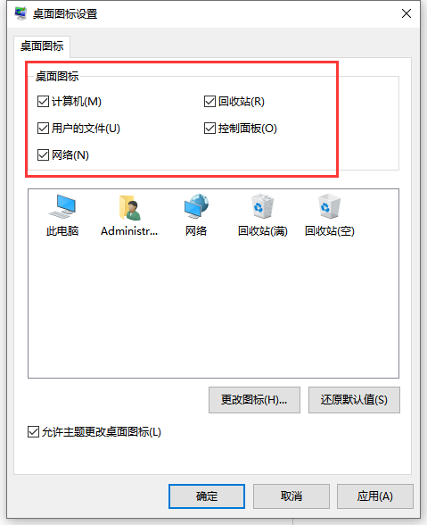 3、在進入到的窗口當中,把桌面圖標里的所有選項,都進行勾選,完成操作之后,單擊下方的確定按鈕即可恢復桌面圖標。
