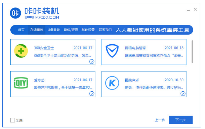 1、首先在電腦上下載安裝咔咔裝機工具,選擇win7系統,點擊安裝此系統,點擊下一步。