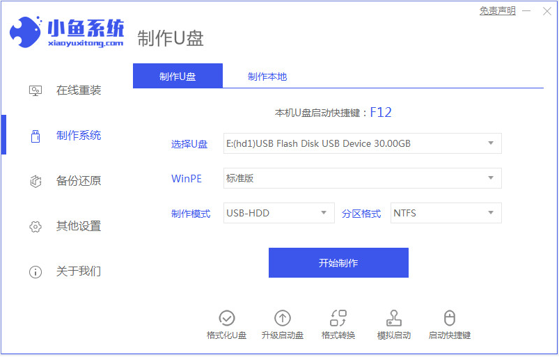 1、在一臺能用的電腦上安裝并打開小魚一鍵重裝系統工具,插入1個8g以上的空白u盤,進入制作系統模式。