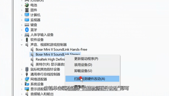 4、如果還是不行,右鍵單擊驅動選擇“掃描檢測硬件改動”。