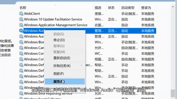 2、找到“Windows Audio”右鍵選擇“屬性”打開。