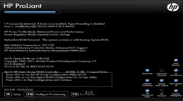 1、hp服務器重裝系統方法,首先開機看到下圖界面按下F10,然后進入引導操作界面。
