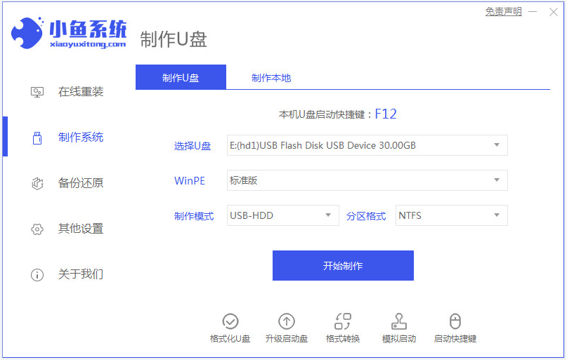 1、先在能用的電腦上安裝并打開小魚一鍵重裝系統工具,插入1個8g以上的空白u盤,進入制作系統模式。