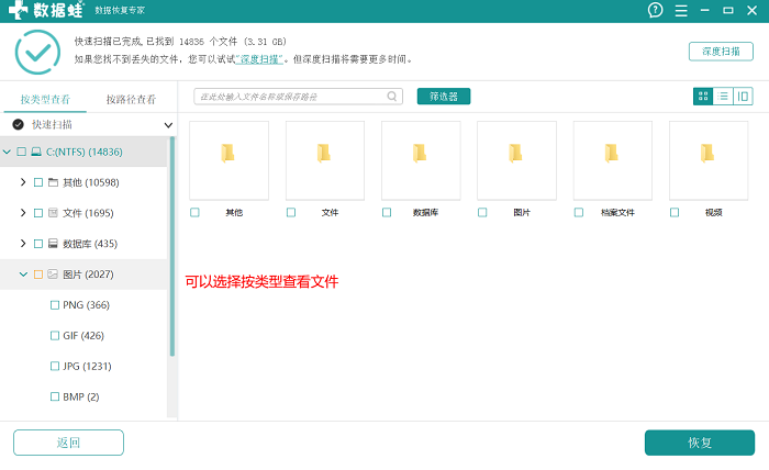 2、【快速掃描】結果出來后,可以直接在界面左側選擇【按類型查看】,這樣出來的結果更加直觀。您也可以選擇【按路徑查看】,根據自己的實際情況來選擇。
