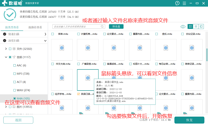 3、第一次掃描沒有找到要恢復的文件,可以通過點擊【深度掃描】來查看更多。【篩選框】是可以輸入文件的名稱來快速查找的。文件出來后,鼠標箭頭可以選擇放在它的上方,這樣就可以直接查看文件的相關信息。選擇要恢復的文件,點擊【恢復】。