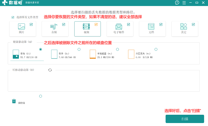 1、關閉注冊頁面,選擇試用。在掃描頁面,先選擇要恢復的文件類型,再選擇要恢復的文件位置(不記得可以一一選擇,在掃描結果里面找到您要恢復的數據為止)。最后就可以開始【掃描】了。