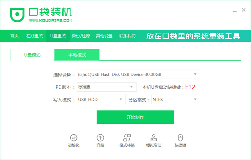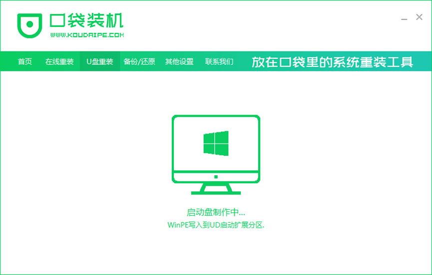 1、下載安裝口袋裝機軟件后,將u盤插入電腦點擊u盤重裝系統。