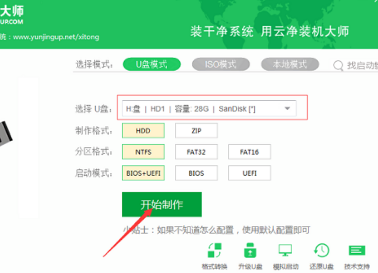 1、下載安裝云凈U盤啟動制作工具并打開,插入u盤,點擊制作U盤啟動盤。
