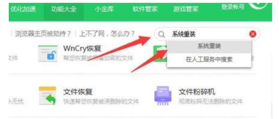 打開360衛士,點擊功能大全;搜索重裝系統;提前備份數據,然后重裝大師會自動進行重裝。