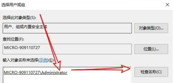 6.接著就會彈出“選擇用戶或組”,在下方輸入“administrator”,然后點擊“檢查名稱”;