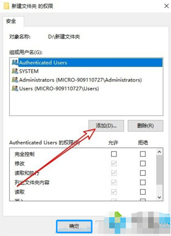 5.在打開的文件編輯權限窗口,點擊“添加”;