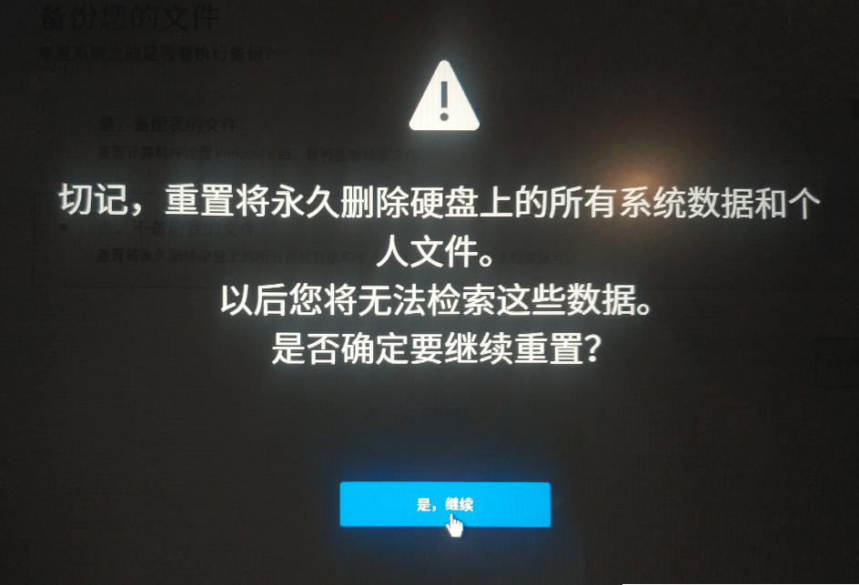 6、彈出提示:切記,重置將永久刪除硬盤上的所有系統數據和個人文件。以后您將無法檢索這些數據。是否確定要繼續重置?點擊【是,繼續】,此步驟開始后,將刪除硬盤上的數據和文件;