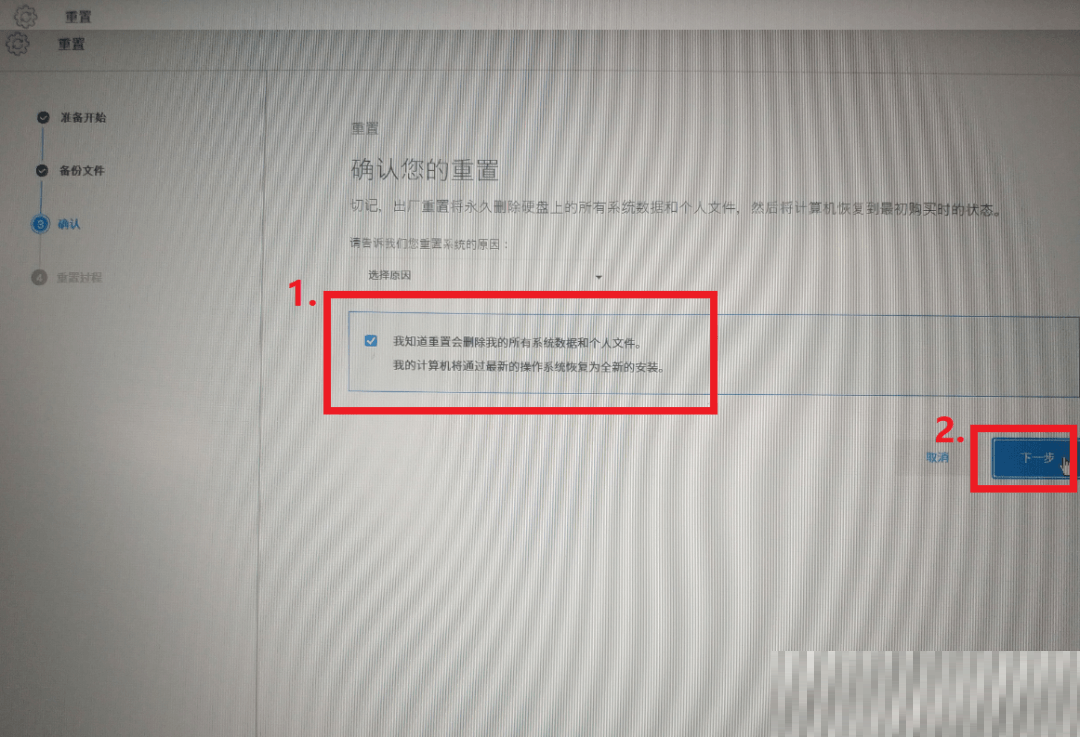 7、勾選【我知道重置電腦會刪除我的所有系統數據和個人文件】,然后點擊【下一步】;