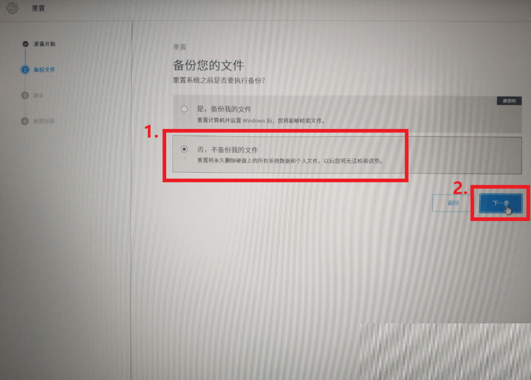 5、選擇【否】,不備份我的文件,然后點擊【下一步】(如果您需要備份數據,建議您在系統下備份好在進行恢復,因為本軟件備份文件,可能會因為某種細節原因導致備份失敗,而無法還原。如果您實在無法進入系統,那您可以選擇此選項,但可能因特殊情況無法正?;謴蛡浞莸奈募?;