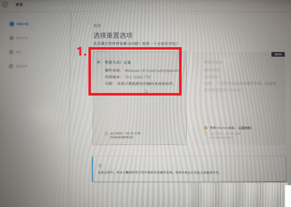 4、選擇【重置為出廠設置】,然后點擊【下一步】;