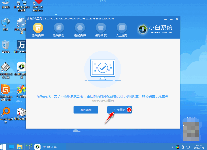 當提示安裝完成后,需要先拔掉u盤,然后再重啟電腦。