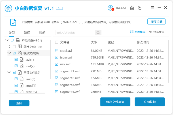 多種恢復模式:小白數據恢復軟件支持多種恢復模式,可以根據不同的數據丟失情況選擇合適的恢復模式。