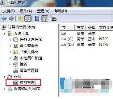 2、在左窗格中的“存儲”下面,單擊“磁盤管理”