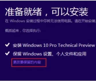4、在開始安裝以前,點一下“更改要保存的內容”,將C盤所有重置。點擊打開一步,等候重新檢驗后開始宣布安裝。