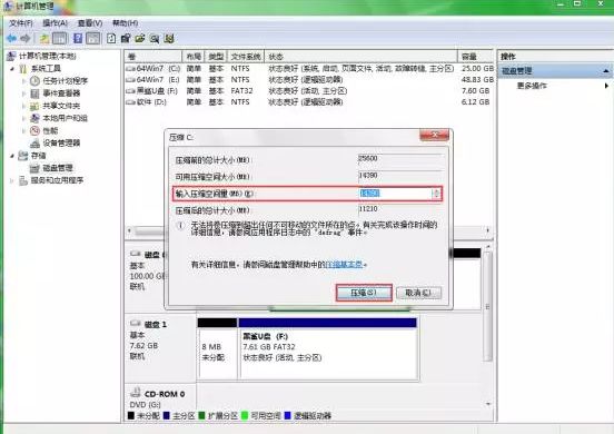 3、在彈出的窗口中輸入需要壓縮的空間量,然后點擊“壓縮”。小編在這里輸入的是默認的值,