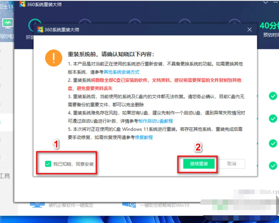 7、彈出來警告界面勾選我已知曉同意安裝然后點擊繼續重裝。